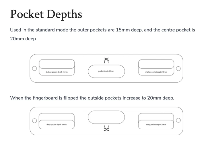 - When the fingerboard is flipped the outside pockets increase to 20mm deep.