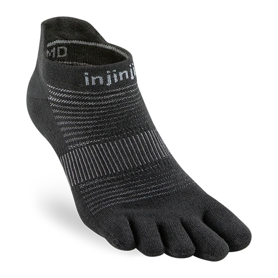 The Injinji Run Lightweight No Show is the lightest-weight sock and is designed for all types of runs on all types of surfaces. The unique five-toe performance design reduces friction, which can cause blisters, and keeps your toes free for a better feel and natural fit on uneven terrain. A mesh top and COOLMAX® EcoMade fibres keep feet dry and cool, and a band under the arch offers support and stability. The no-show length falls below the ankle and has a heel tab to prevent chafing and socks from sliding into your shoes.