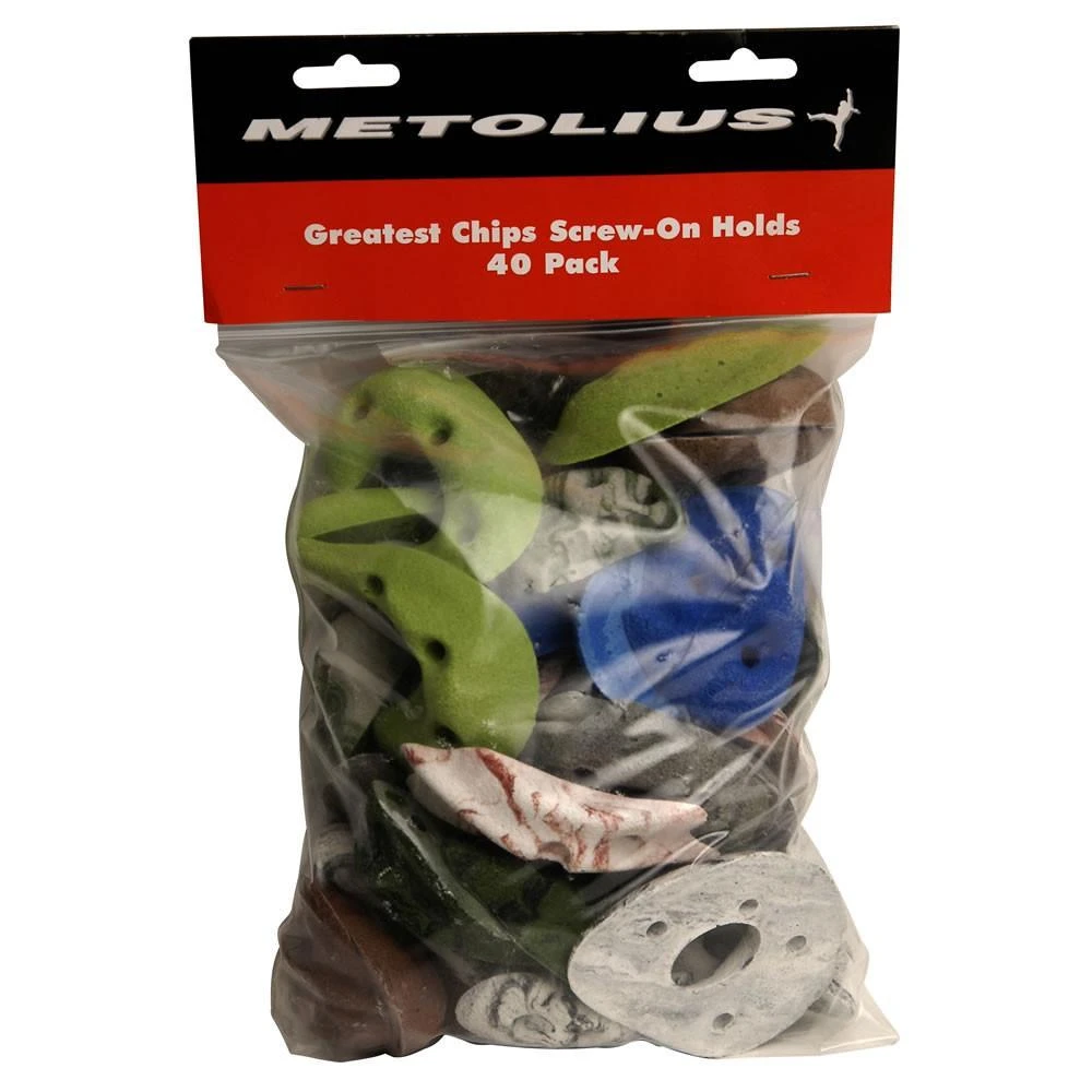 The Metolius Greatest Chips Screw-on 40 Pack are a mixed set of screw-on climbing holds including crimps, micro pockets and foot jibs.