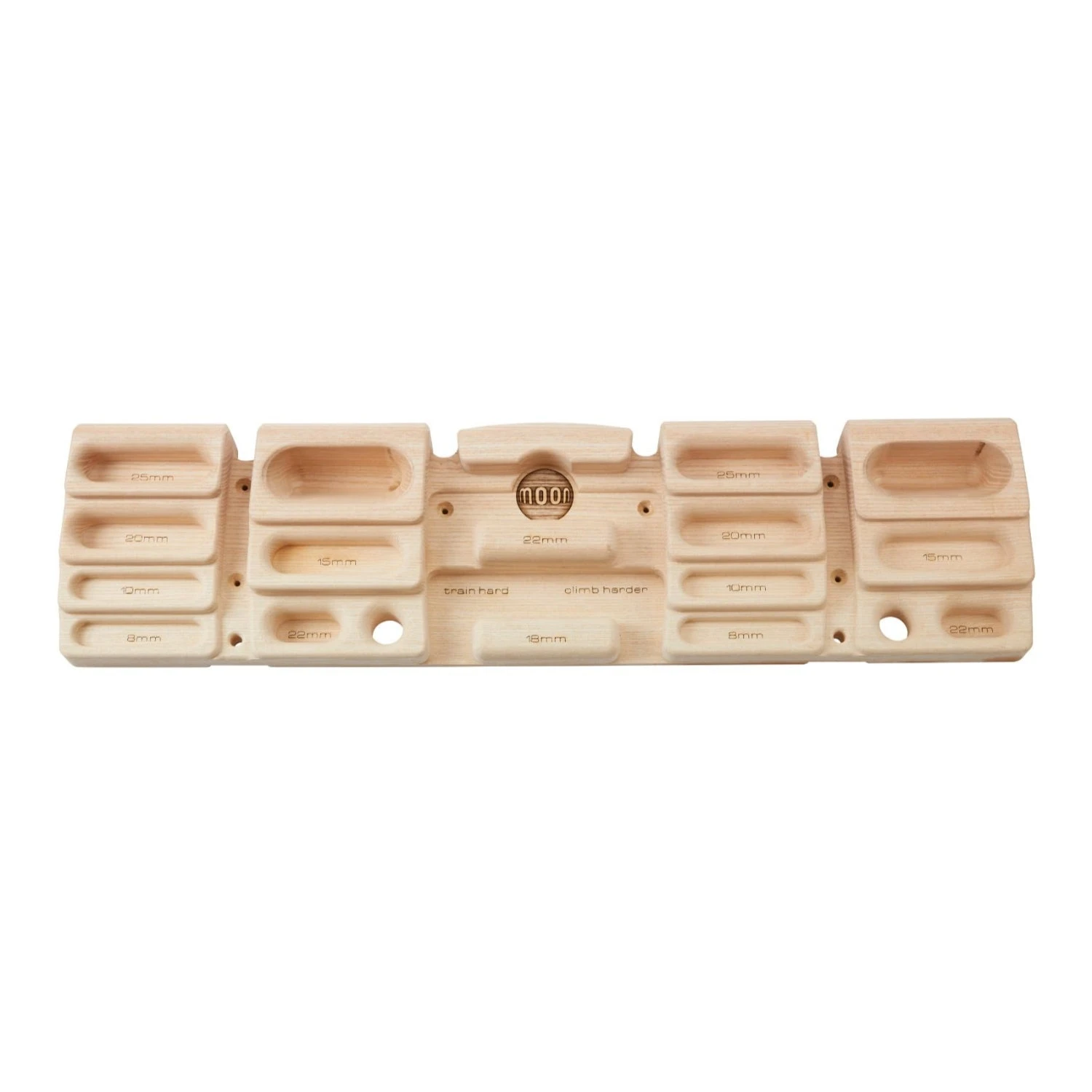 - Incut jug plus 22mm and 18mm edges positioned centrally for one-armed hangs and pull-ups.