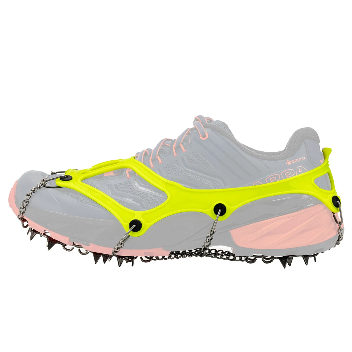 The Hi-Tech Elastomer harness makes them quick-fitting and comfortable and allows them to easily slip on over your regular footwear. Like studded snow chains for your feet, the Nortec Fast Spikes provide great performance on slippy terrain in a lightweight package perfect for those winter runs or speedy hikes.
