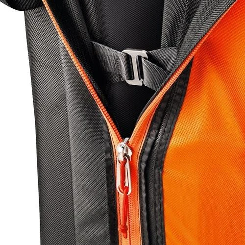 Petzl’s patented folding system: zippered flap closure covers the carrying system, for greater protection and to create a storage space during transport